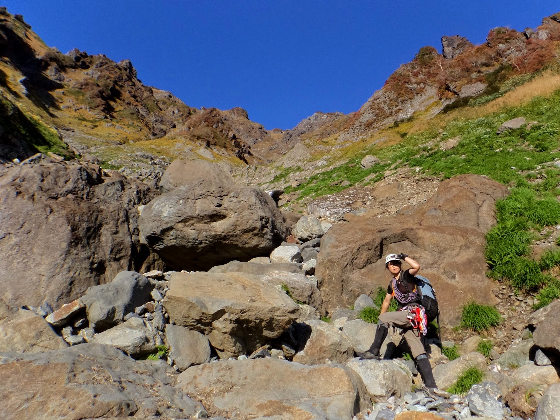 3連休の計画が雨予報で流れた末の山行でしたが、女子3人(つっこみ禁止)、澄んだ青空の下でスラブ沢と岩稜の両方を満喫しました。