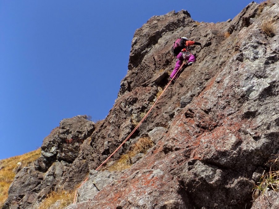 4P(50m/ K池リード):正面に1本クラックが走った3mほどの壁があり残置スリングがあるが、皆の意見をききこれはやめ。左の壁を一段上がるとⅡ級ほどの尾根が右 方向に続いているのでこれを上がる。ここから一気に稜線のハイカーの注目の的に。目いっぱいロープを伸ばしピナクルで切った。